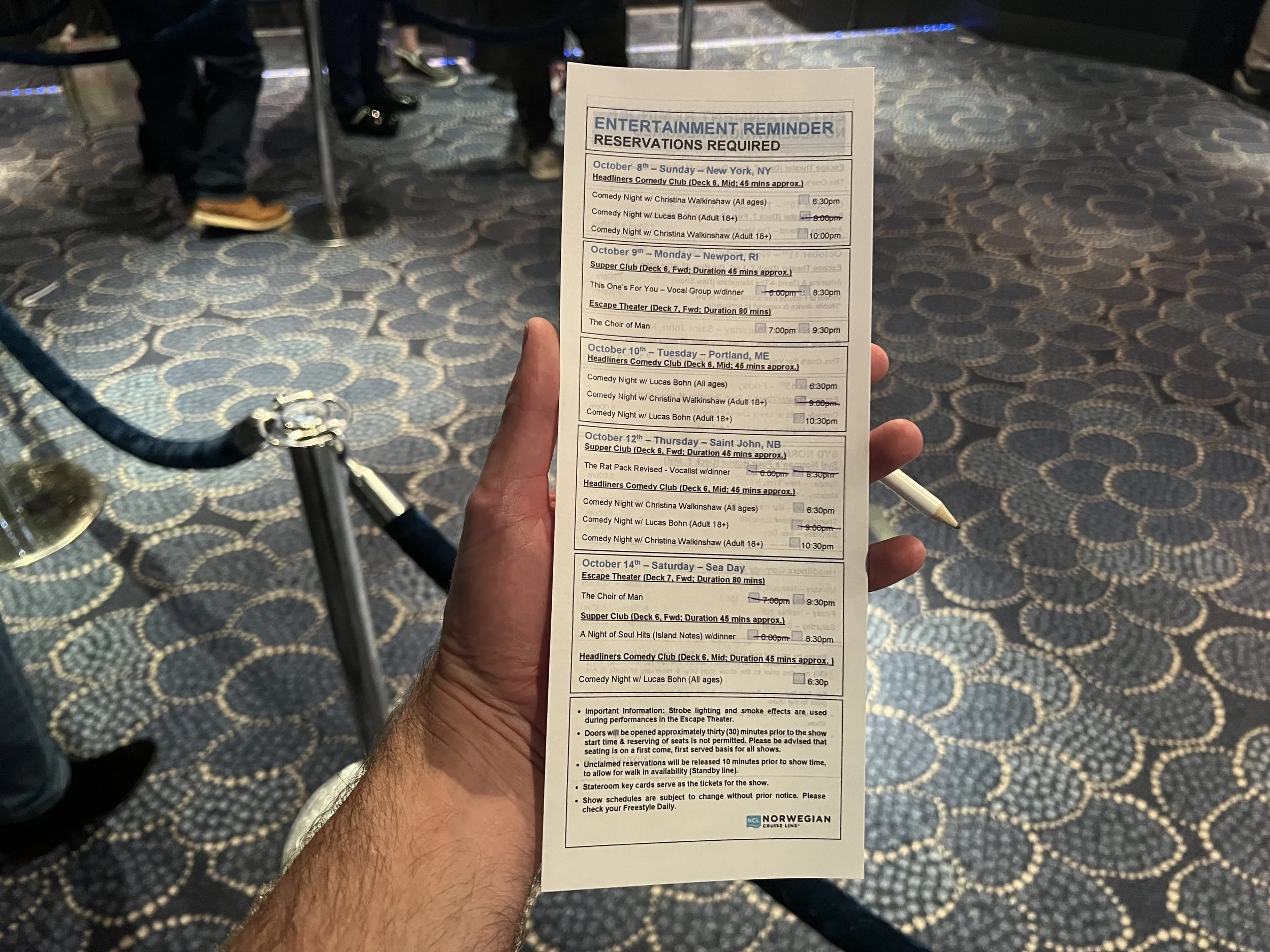 One key bit of advice that I would offer you is that it’s important to check, as soon as you board your cruise, which entertainment you’re going to need to book, versus which you can just turn up to if you fancy it on the night. It’s super easy to do this - I found a leaflet in the Studio Lounge after I boarded when I nipped through for a coffee, but you can also collect from the Box Office desk outside the theatre. Here’s a photo of that bit of paper, to help you understand what I’m referring to here: