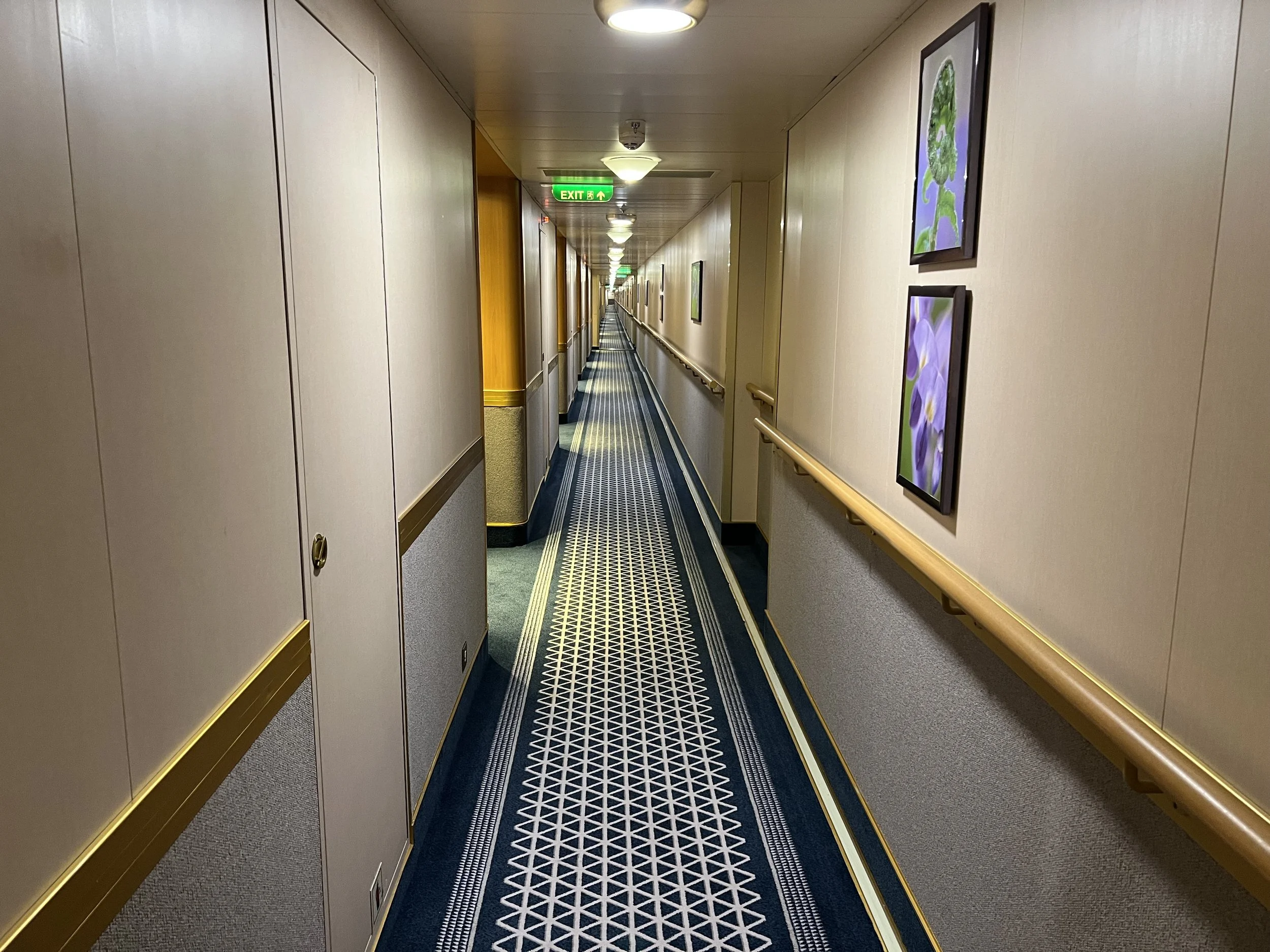 Additionally, there was (what seemed like) brand new carpeting fitted to the walls, and so I would suspect that this has been added or refreshed during the refit. This is completely normal on cruise ships - carpets will often be fitted to the walls to minimise damage to walls during processes like luggage being taken onto the ship, and off again at the end of the cruise. They also really help to absorb noise out here!