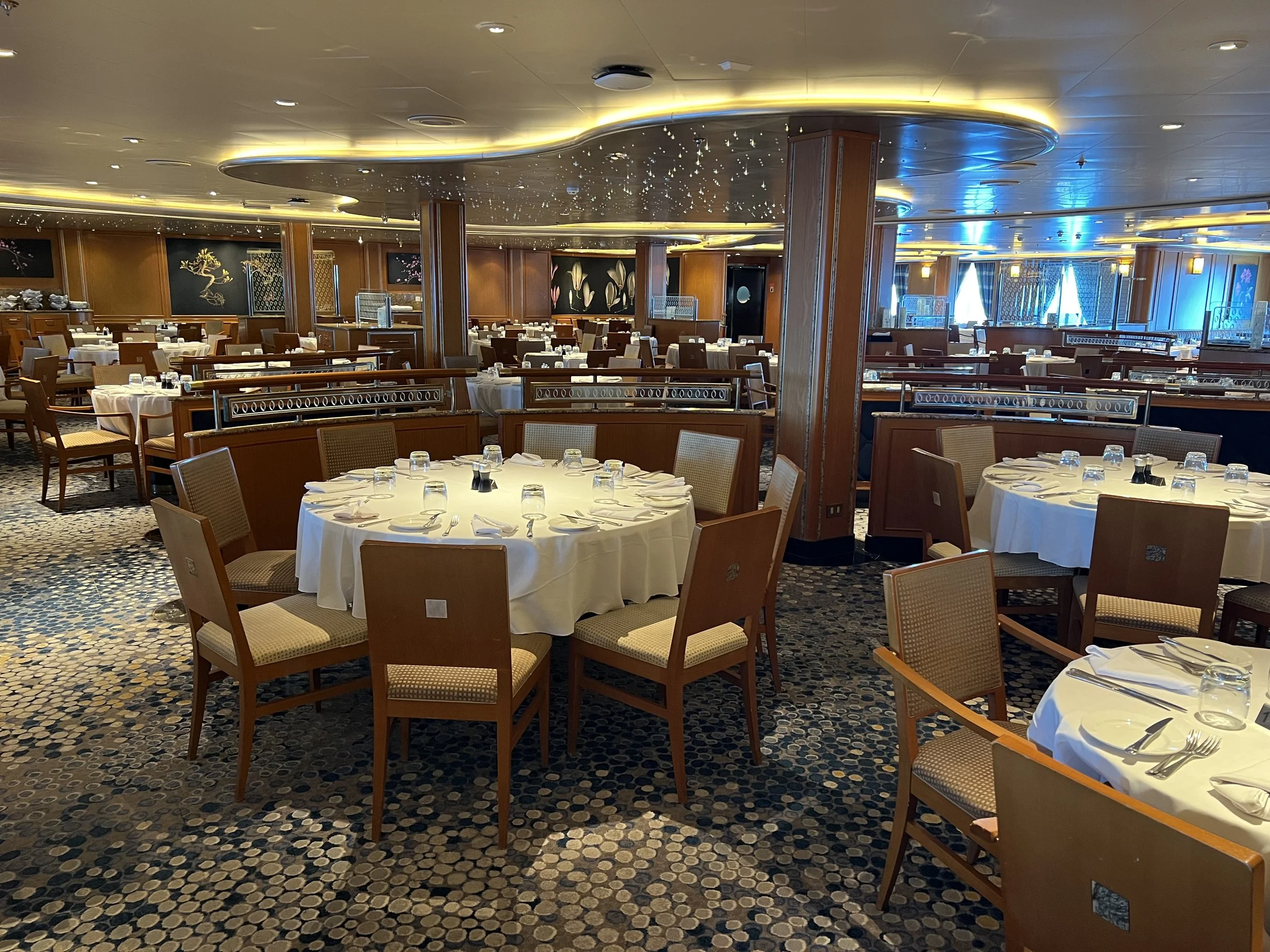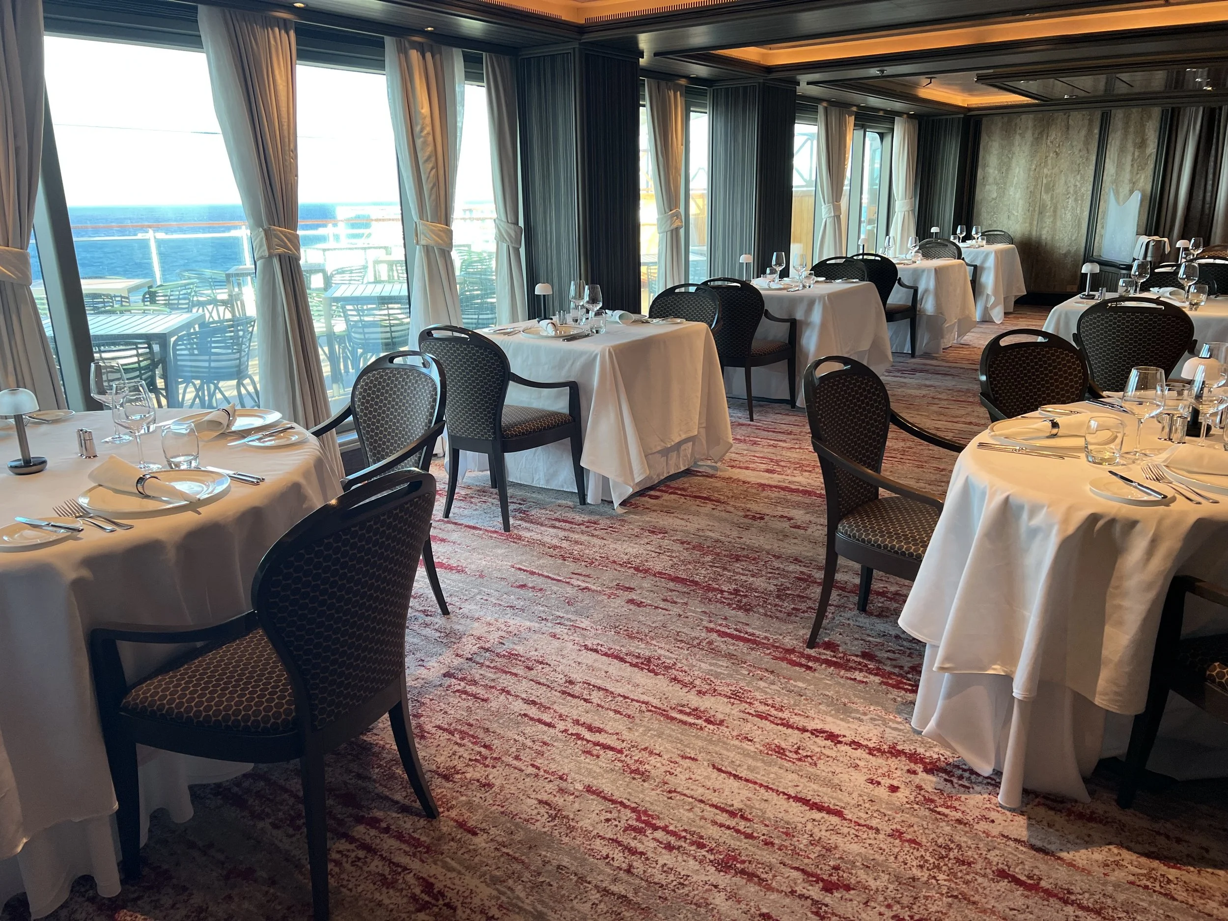 The position of this restaurant is great - it’s right at the back of the ship on Deck 17, which allows for some excellent views looking out across the back of the ship. There’s both indoor and outdoor dining here - it’s quite rare to see anyone eating an evening meal outside here, but fairly common to see some Suite guests enjoying breakfast out here in the mornings.