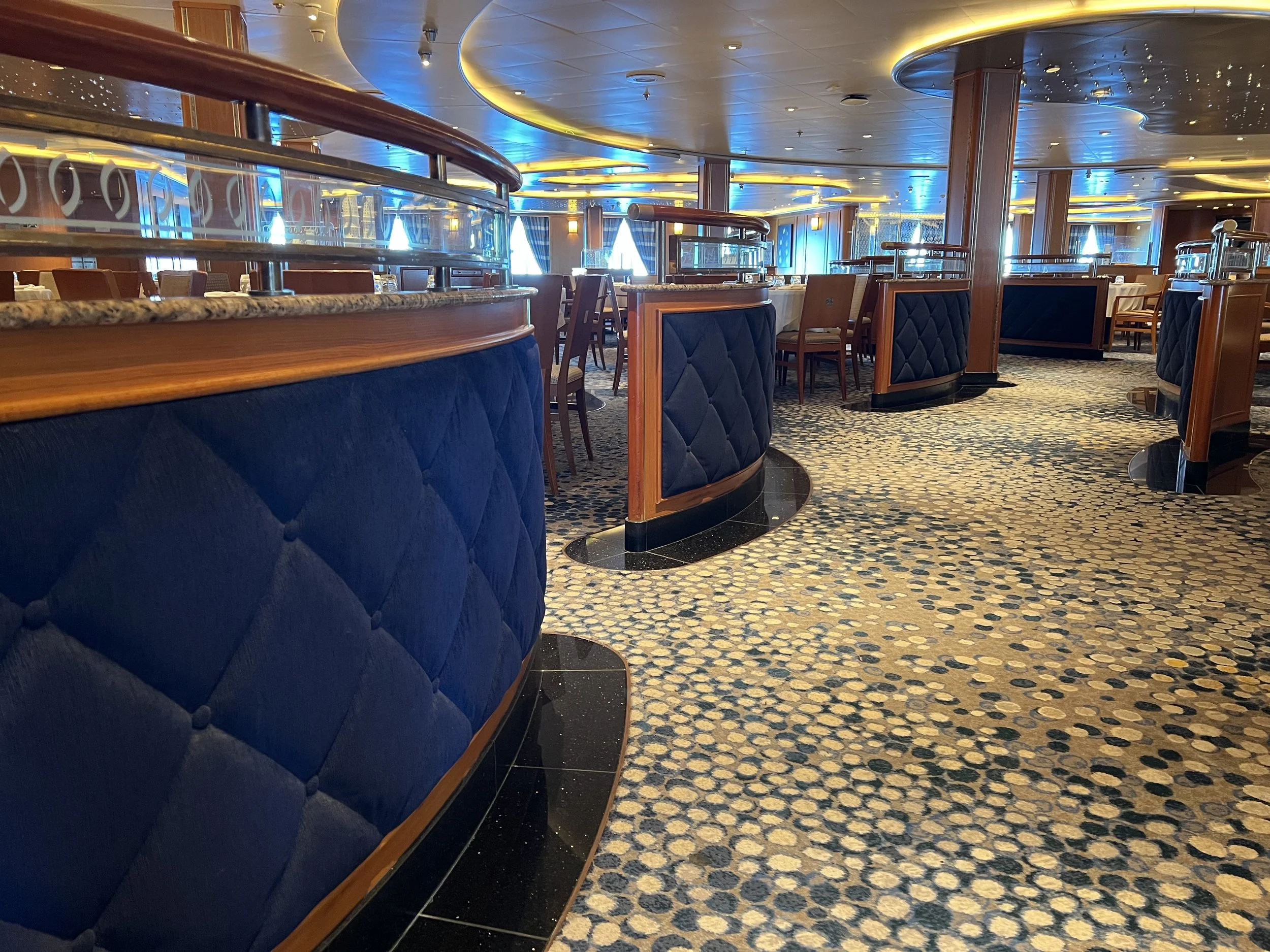 This restaurant has received quite a ‘glow up’ during the recent dry dock refit, with new carpets throughout, new upholstery on some of the furniture, and new cushions on the booth-style seating.