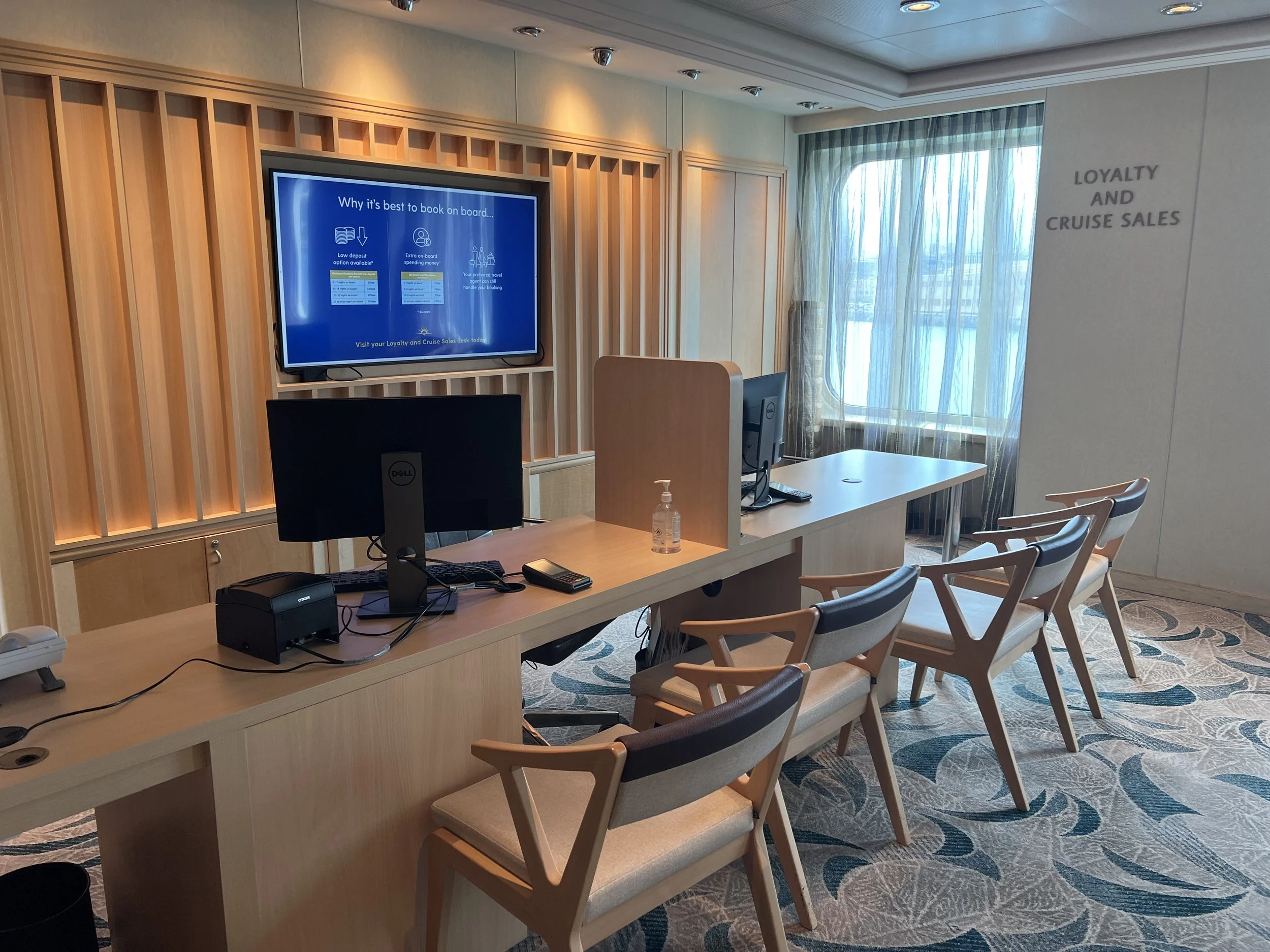 If you’d like to book a future cruise while onboard the ship, or if you’ve got a question about the P&O Cruises loyalty programme (which is called Peninsular Club), then you’ll be delighted to know that this space has been refitted. Here, there are now digital screens behind the crew, which are used to display various promotional content and offers.