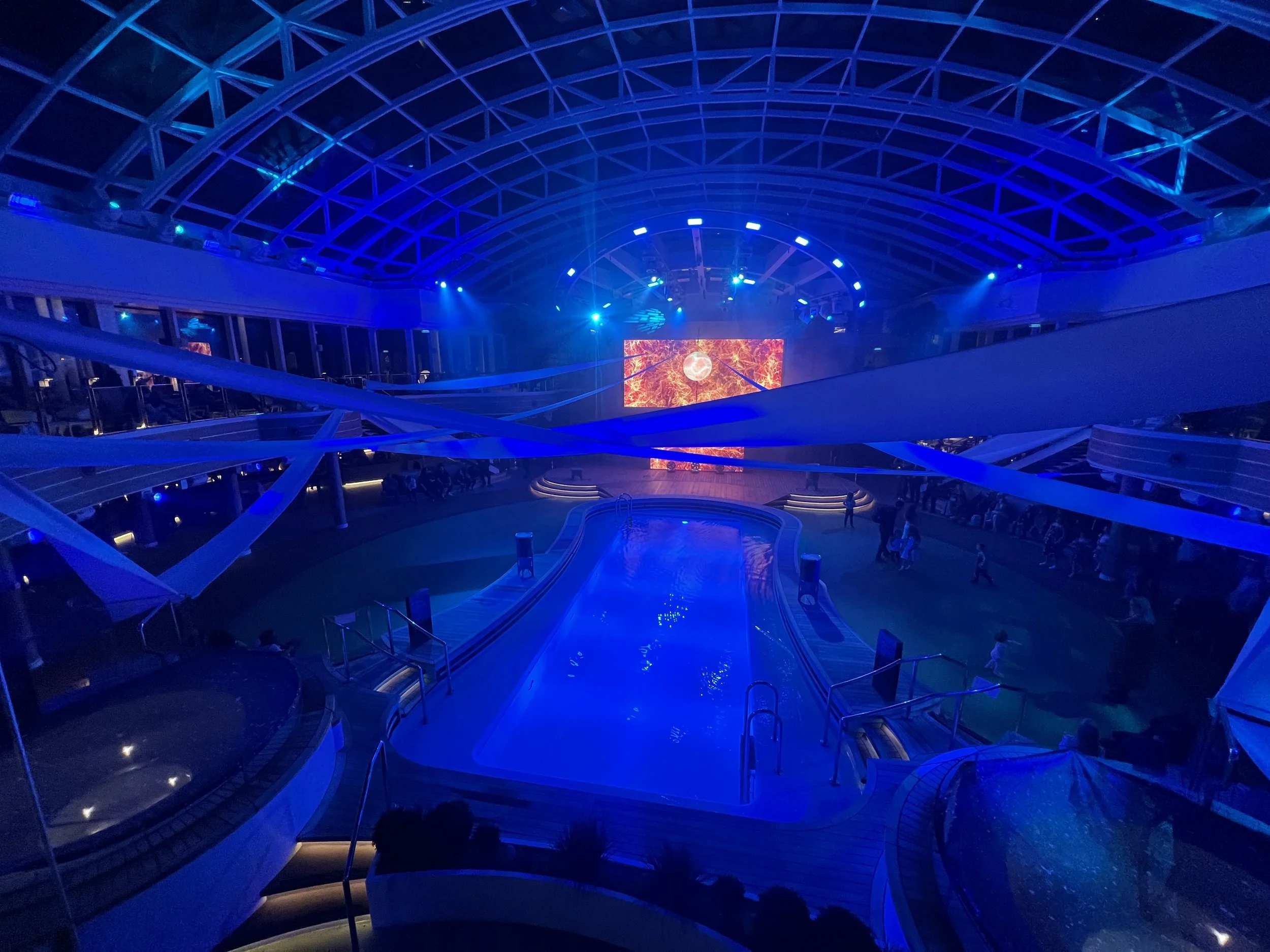 In the evening, the SkyDome pool is a really great space to relax and spend time away from the crowds onboard a ship of this size. Of course, you’re going to find some entertainment up here (think things like the silent disco or the ‘top deck productions’ that you’ll find offered onboard this ship class but, outside of these times, it’s often a quiet haven up here!