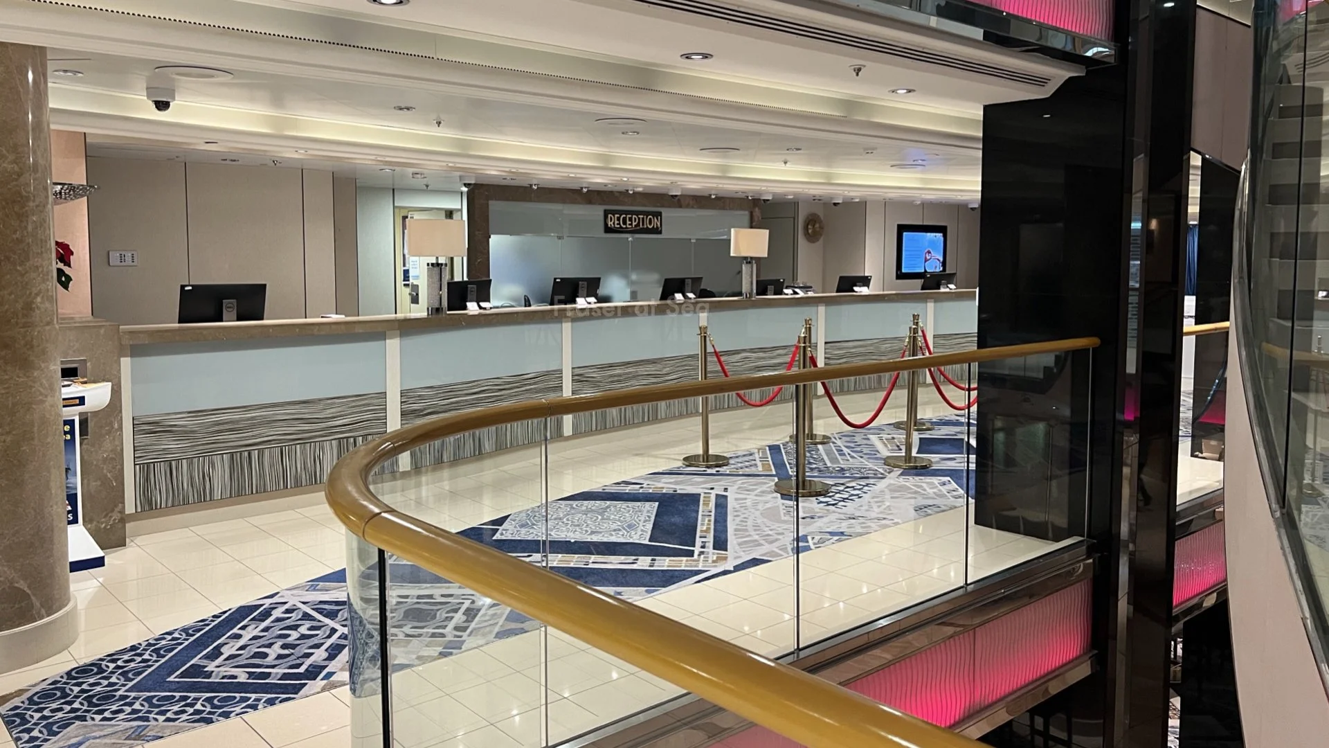 Another facility that you’ll find on the middle floor of the Atrium space is Reception, or Guest Services. If you have any questions about anything at all while you’re onboard, or if you need help with anything, then the team here should be able to help you out.