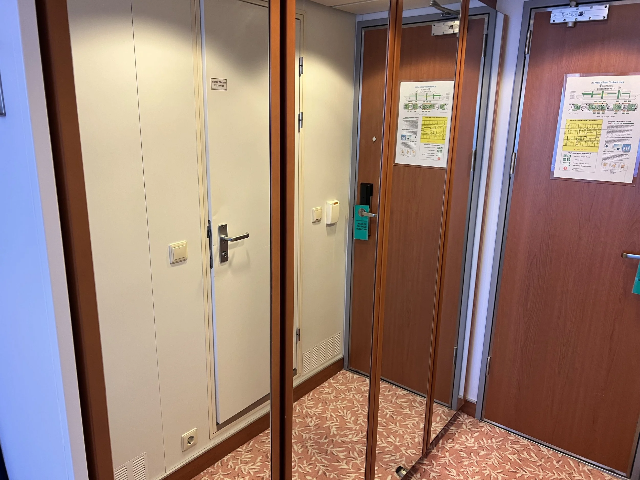 Looking to the opposite side of the cabin, you can see that the bathroom is on one side, and most of the storage for the room is on the other. This consists of wardrobes, and some hooks on the wall.