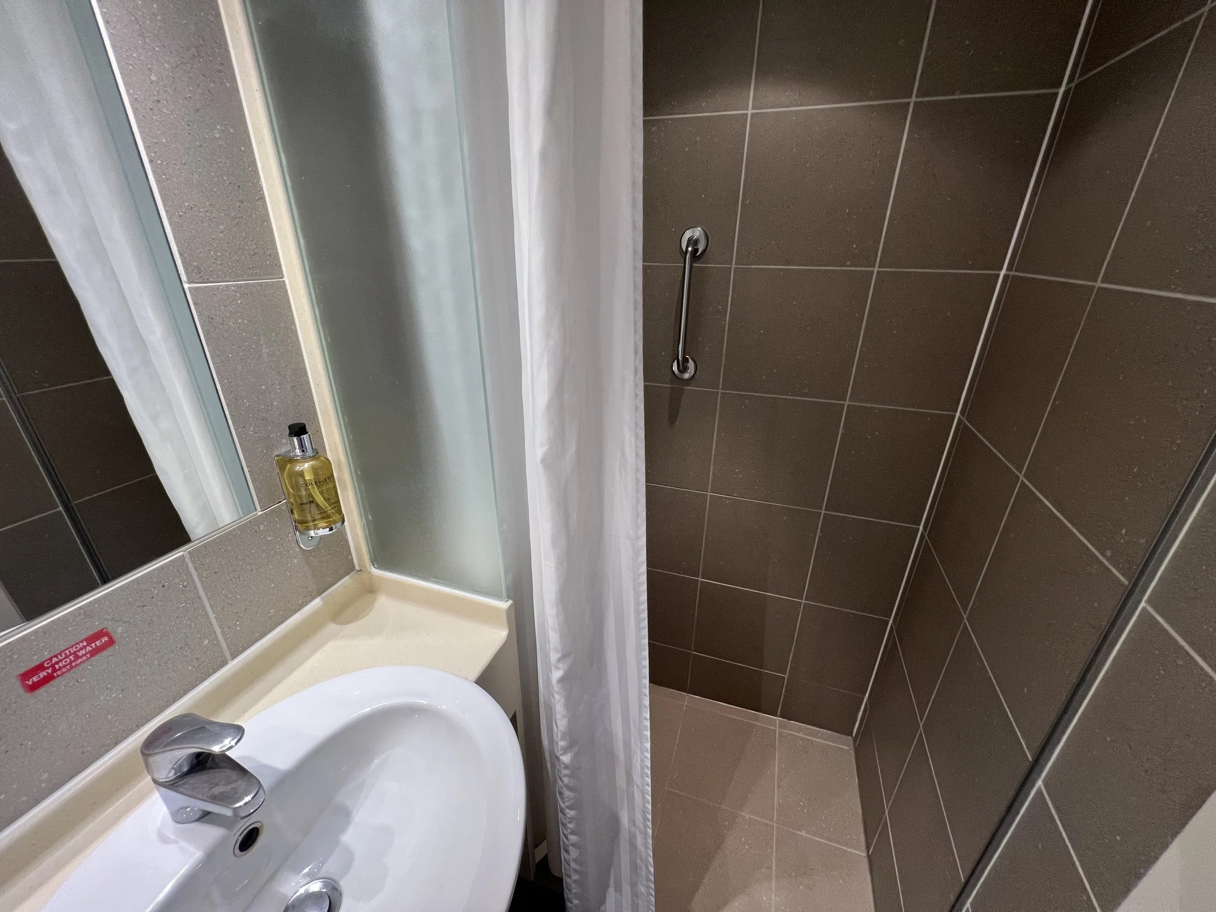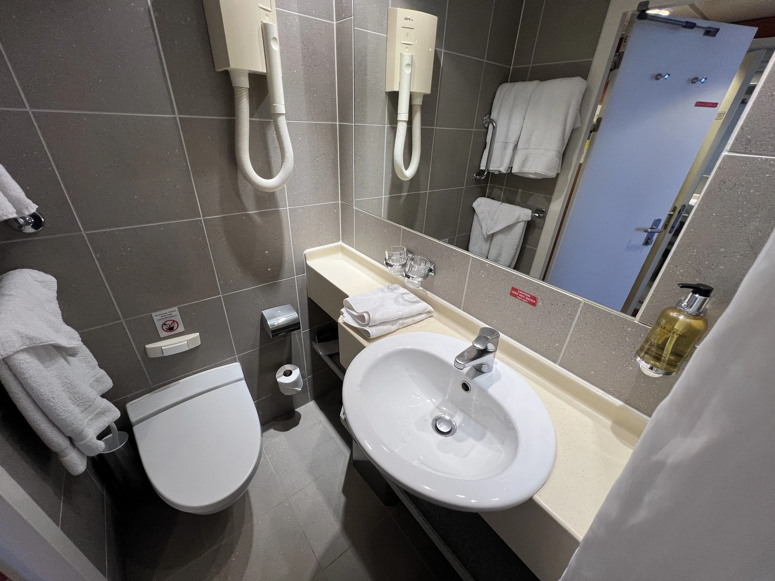 I didn’t expect the bathroom to feel as fresh as it did - I’m assuming that this cabin may have had a bathroom renovation as part of Balmoral’s 2024 dry dock upgrade. In here, you’ve got exactly what you’d expect from a cruise ship bathroom: the sink directly infront of you with a large mirror above, the shower cubicle on the right and the toilet on the left.