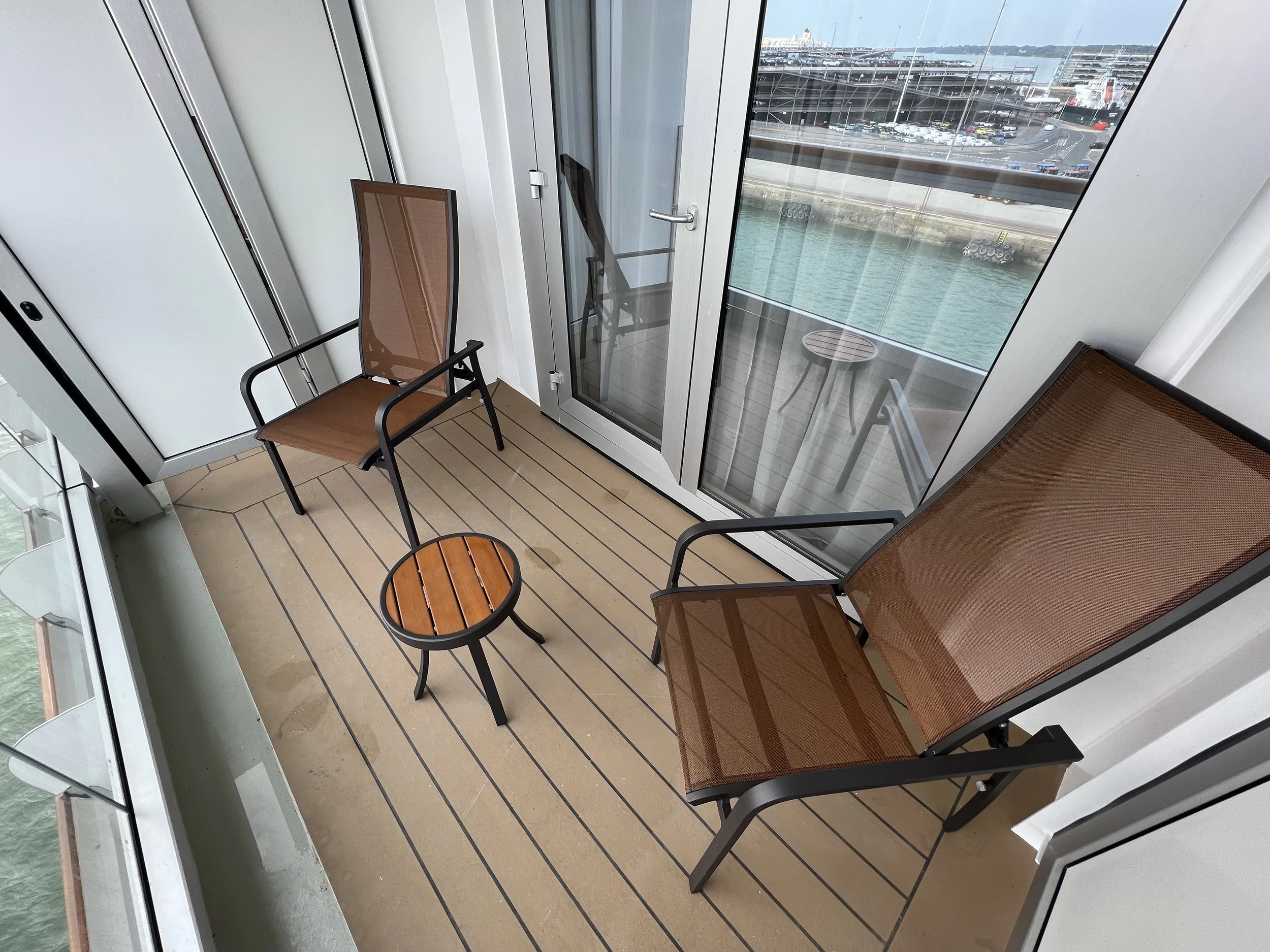 Moving to the balcony, there’s not a huge amount to report. We had two chairs and a small table out there, but it’s worth highlighting the word ‘small’ when we’re talking about the table. It wouldn’t be much use for more than a cup of coffee, so don’t go planning to be enjoying lots of outdoor dining out here during your cruise.