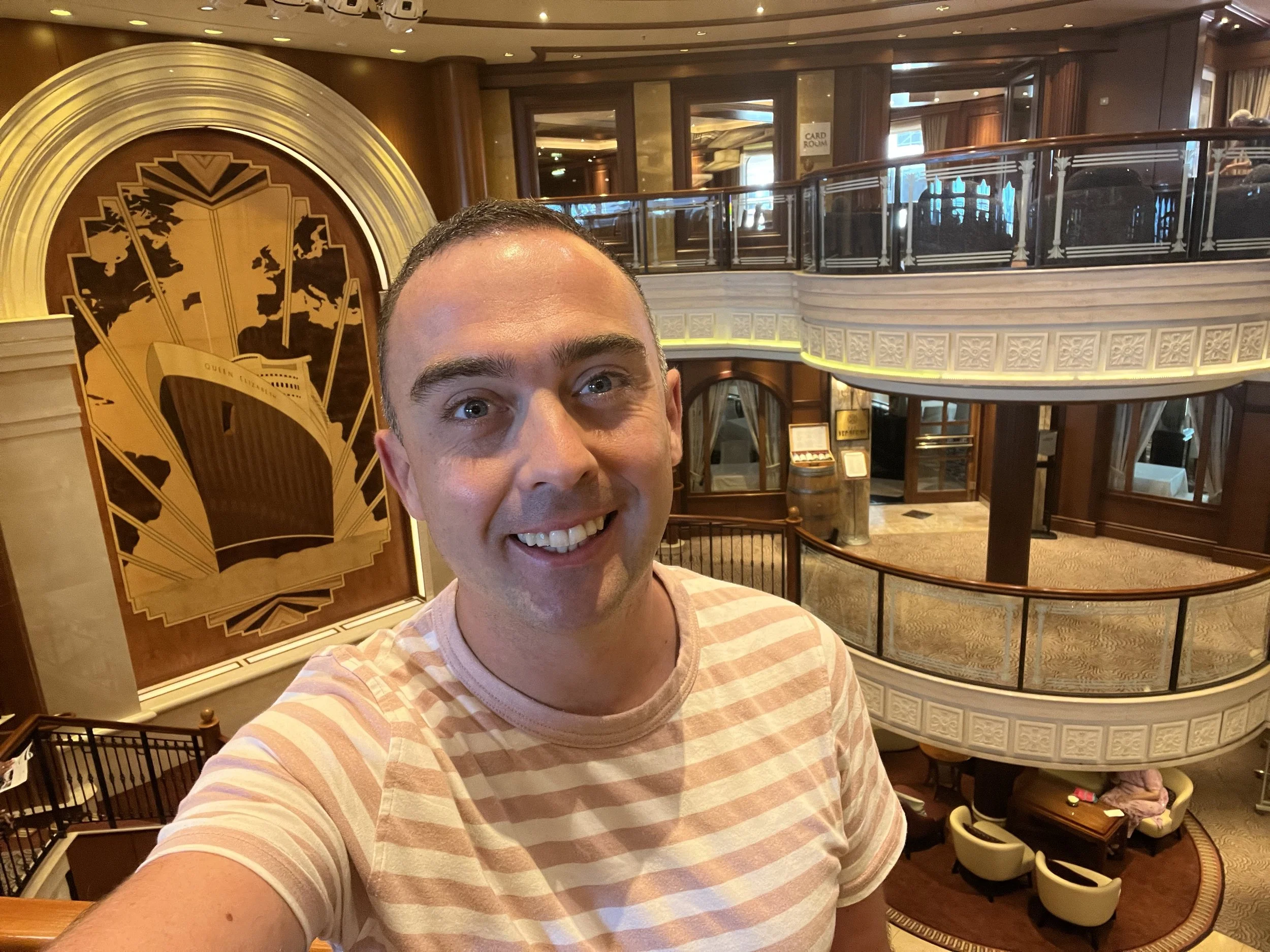 Here’s ‘me’ in Queen Elizabeth’s Grand Lobby, shortly after boarding the ship in California.