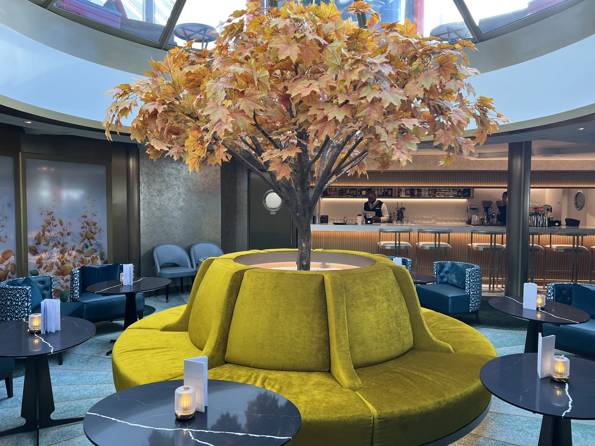 During this cruise, I was also able to take a look at the most exclusive areas onboard that are reserved for only those cruising in the most premium accommodations: the Grills. Onboard Queen Anne, you’ll find a Grills Lounge that’s available for use by anyone staying in a Princess Grill or Queens Grill stateroom during their cruise. In here, there’s a bar to keep you watered, and also a Concierge to help with any needs, questions or problems you might have during your time onboard. The lounge area itself doesn’t have any windows to offer direct views of the ocean (which I did feel was a missed opportunity), but they’ve cleverly got around this by installing a massive roof light window to flood the space with natural light.