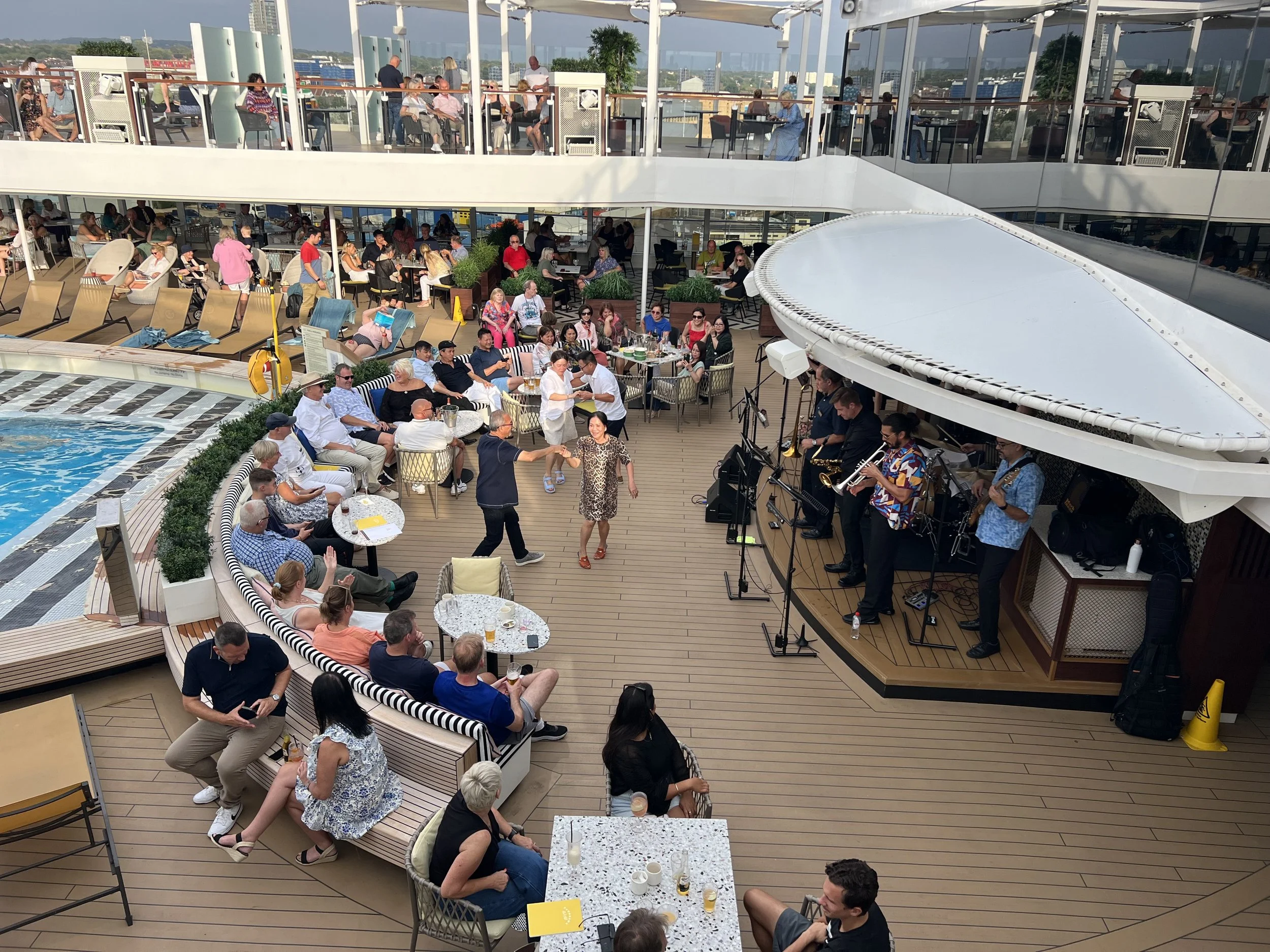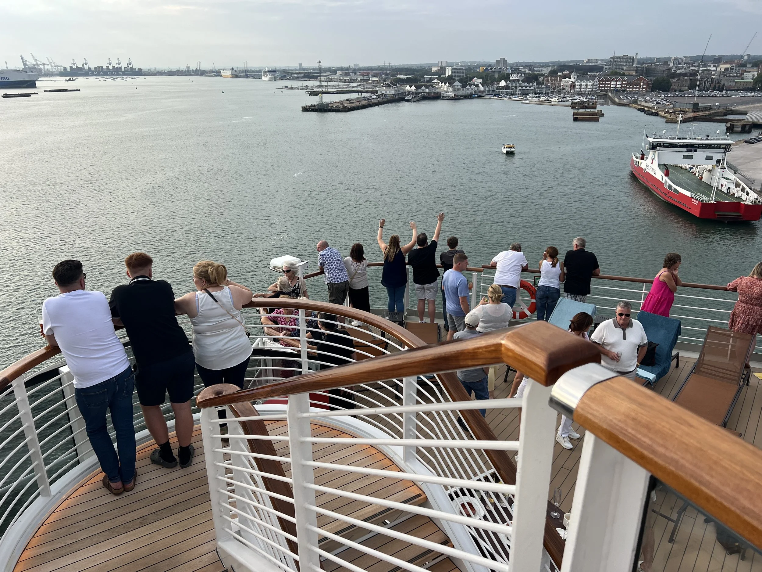 We chose to watch the ship leaving from the Panorama Pool Club, which is the pool deck at the back of the ship on Deck 9. It felt as though the rest of the ship had the same idea - it’s always nice to see a U.K. sailaway party out on the decks busy, rather than being rained off and everyone trying to see through the windows from the inside of the ship.