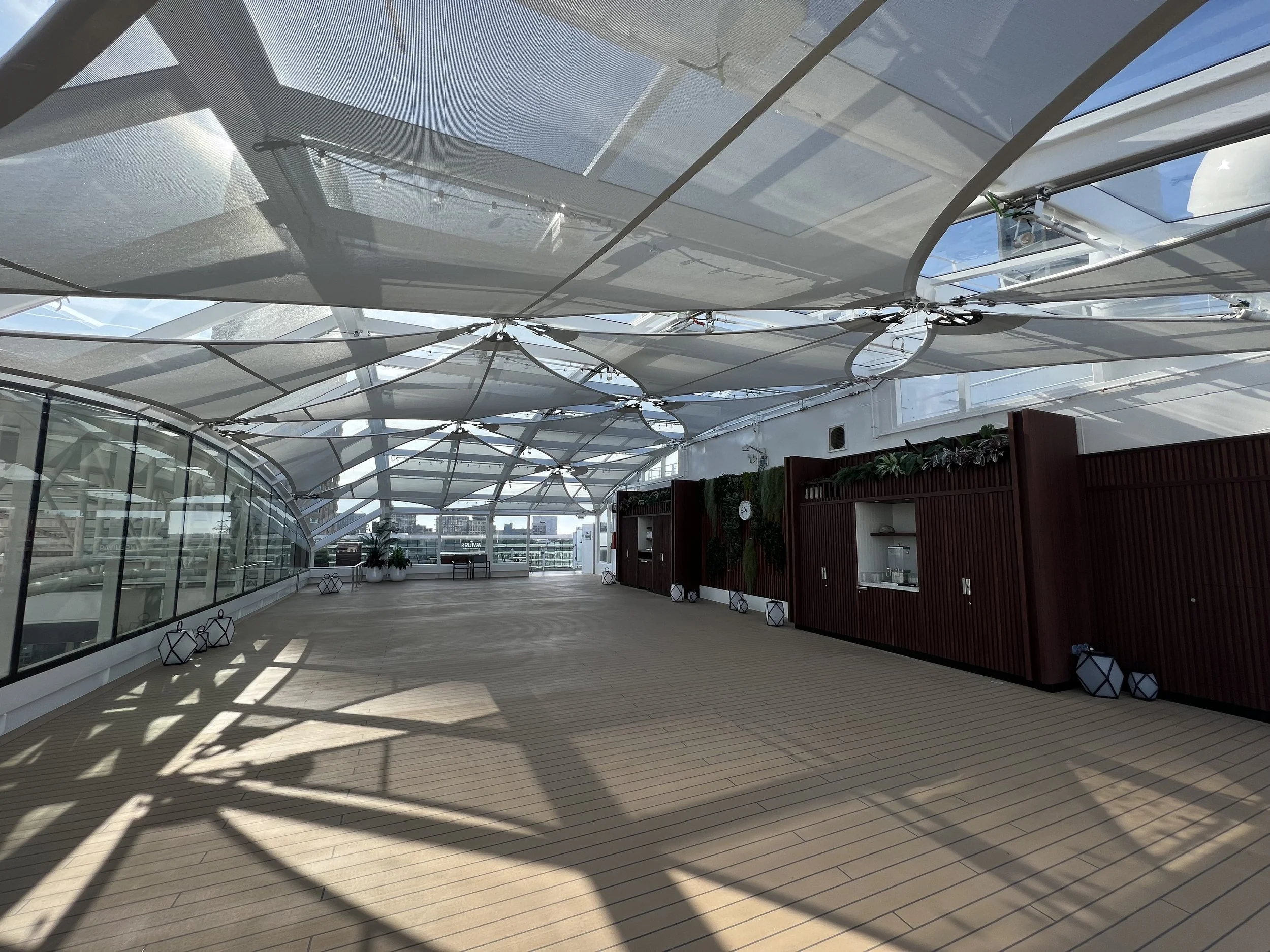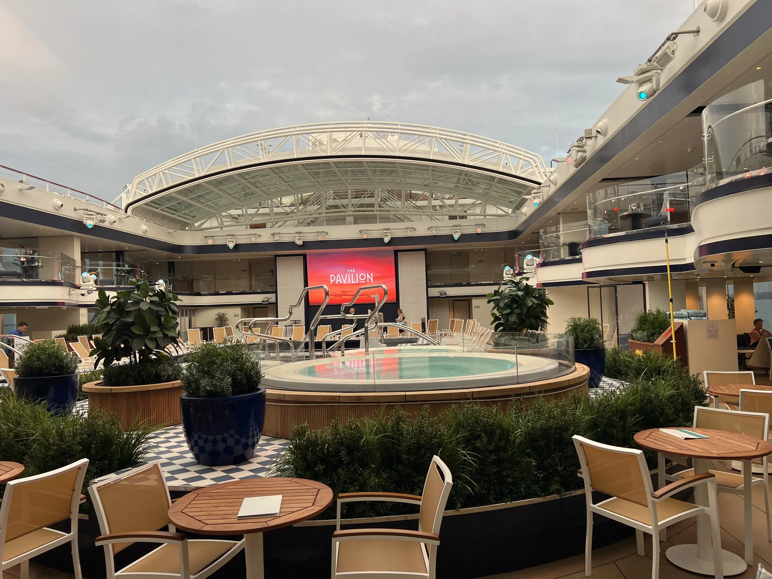After sailing away from Southampton, we took a walk along the top deck spaces before heading down to the cabin to get ready for dinner. This is when we found one of my favourite spaces onboard Queen Anne: The Pavilion.