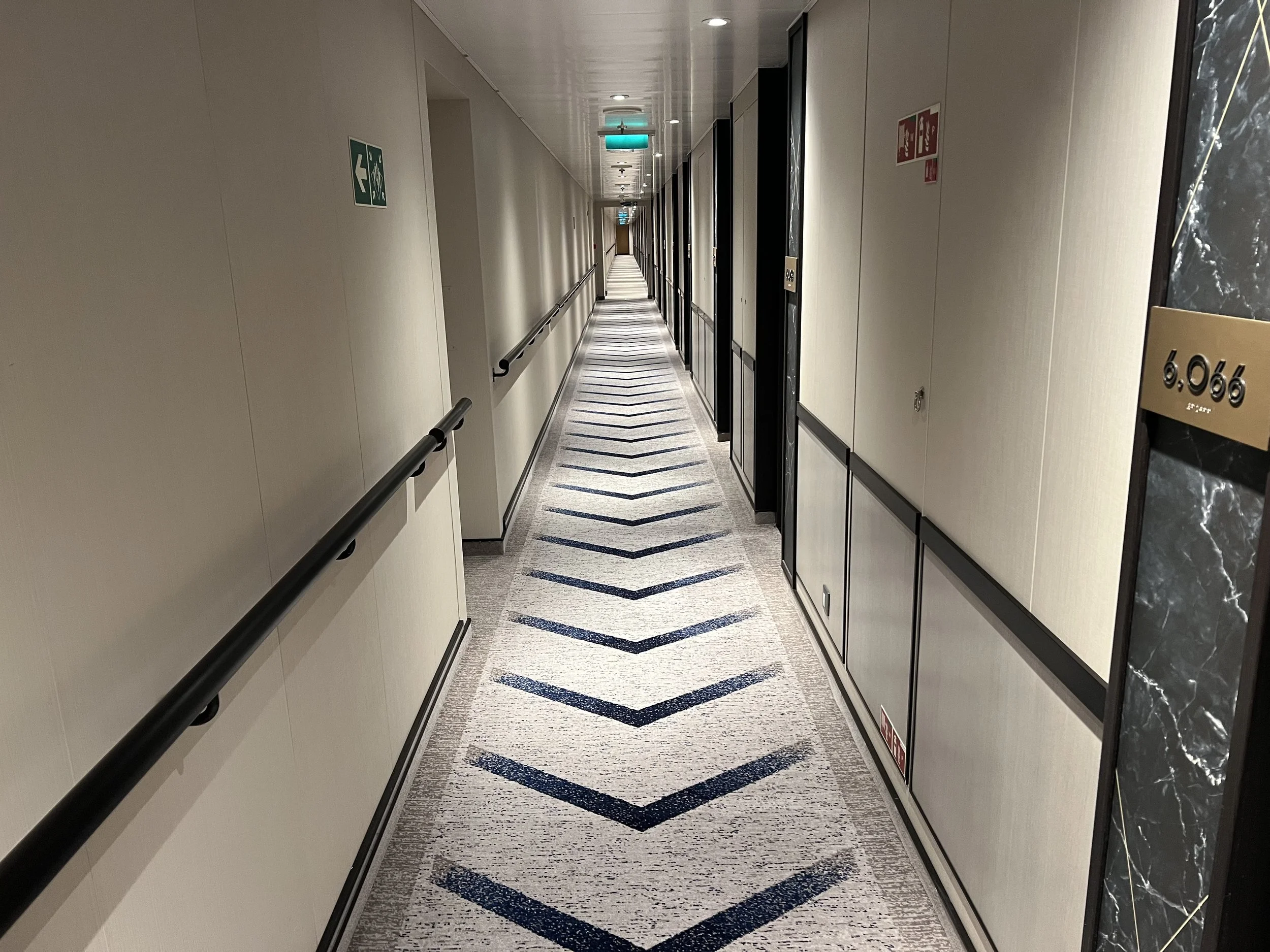 For that reason, Cunard have opted to install carpets with coloured arrows throughout all of these corridors. Each of the lobbies has a different colour associated with it: the one at the front is blue, the one in the middle is yellow, and the one towards the back is red. The coloured arrows on the floor will then tell you not only which direction to walk to your closest lobby, but also which lobby you’re walking towards. Clever, isn’t it?! So remember - blue at the front, yellow in the middle and red at the back!