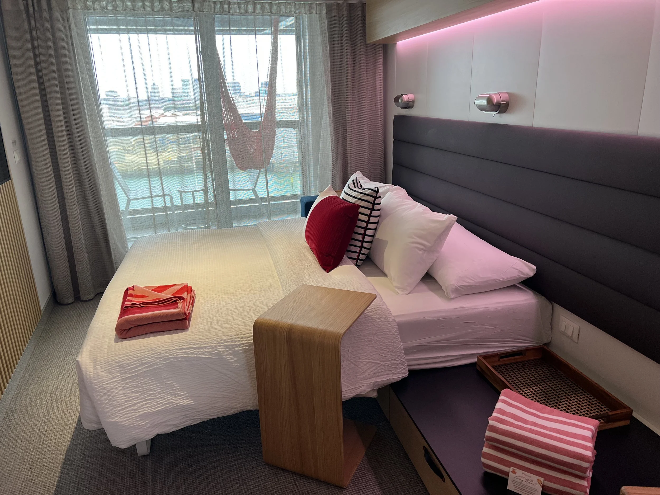 Our cabin had a balcony outside. We knew that we wouldn’t be spending a huge amount of time out here because we had a busy day ahead. It had two metal chairs, a small metal table (big enough for a coffee, but not dinner out there) and a trademark Virgin Voyages hammock. You’ll need to see our video on YouTube if you’d like to see the proof that we did indeed try it out! It would be rude not to, wouldn’t it?!