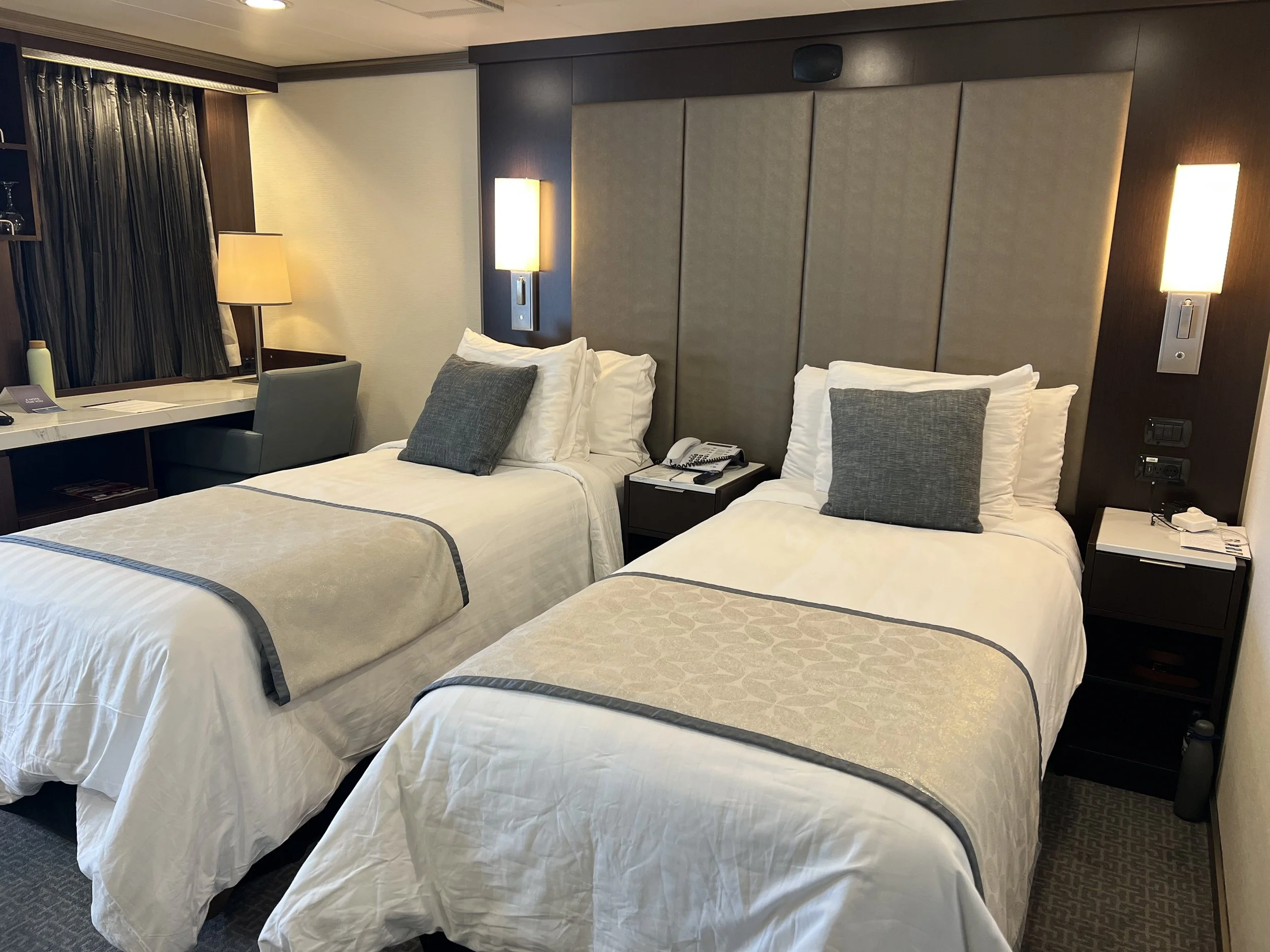 Due to the fact that my friend and I weren’t sharing this room as a couple, we requested to have the beds split into a twin format. We did actually request this at the point of making our booking, so we were a little disappointed to arrive into the cabin to find just one bed. That said, our cabin attendant was incredibly quick to rectify this while we were at dinner on our first evening, and the positive is that I was able to get photos of the room set up as above for all of you!