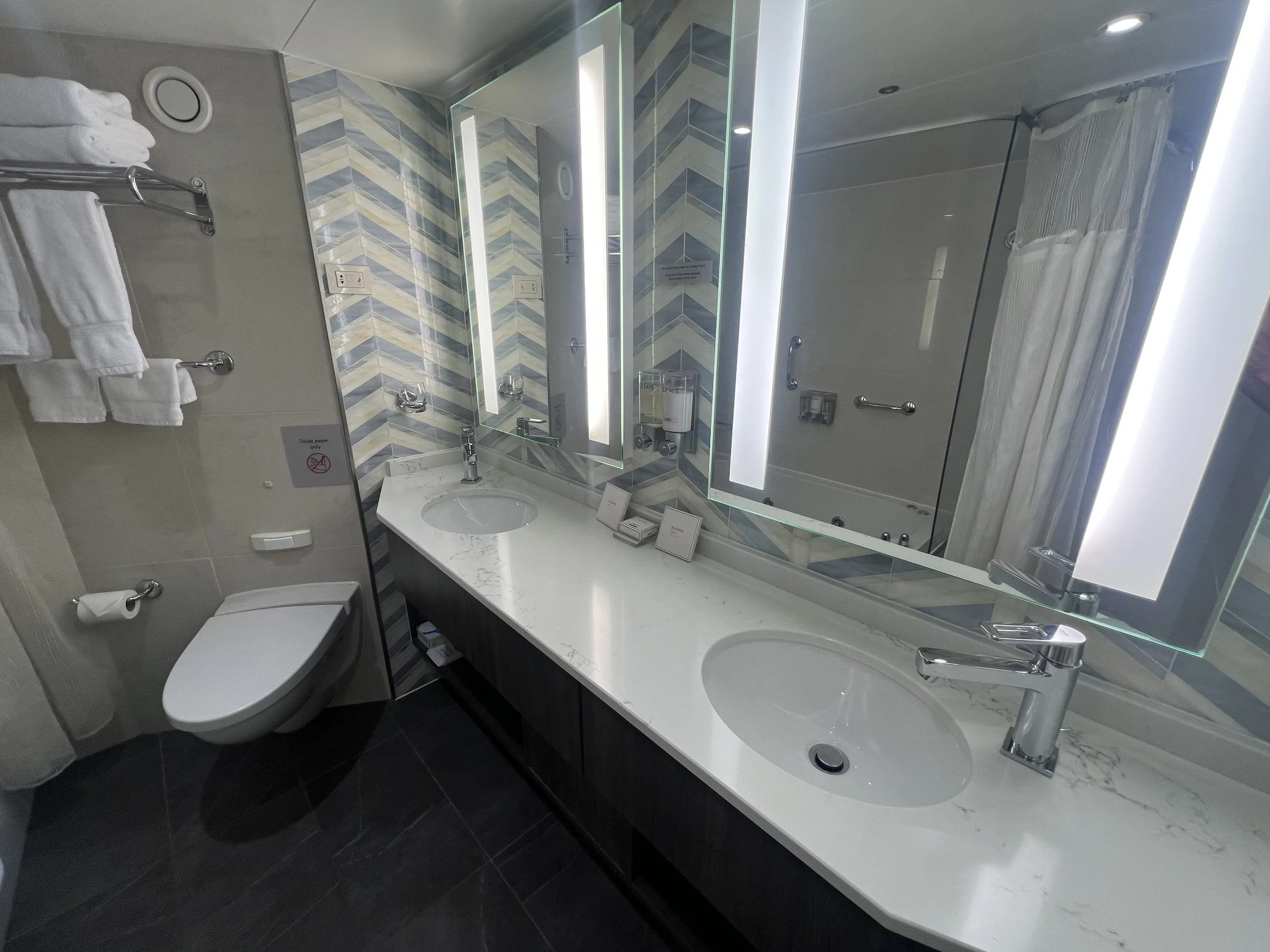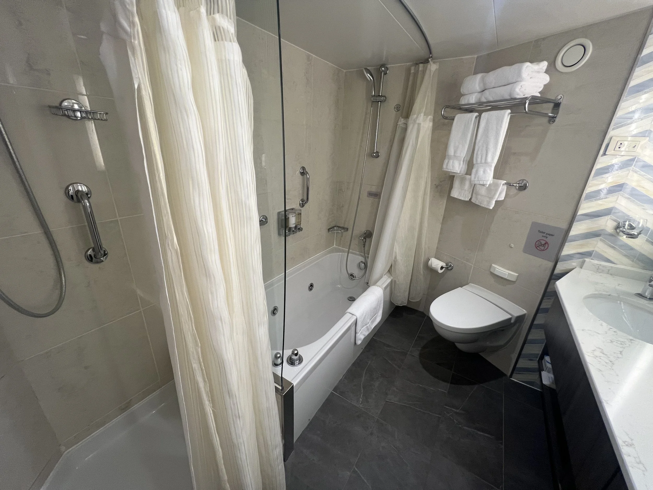 Second, the BATH! This was such a luxury for a cruise ship, although shockingly I never got to use it. During our 7-night cruise, there was only 1 time window where I was ready to relax and enjoy a bath. Annoyingly, there was a little red light showing on the bath panel during this period, which I assumed to be to do with the fact that the ship was sailing as it was a little rockier than normal. This meant that I wasn’t able to use the jets in the tub, which was SUCH a shame. Yes, I could’ve filled the bath to have one similar to what I’d have at home, but I didn’t see much point - I really wanted to have a jetted bath on a cruise ship!