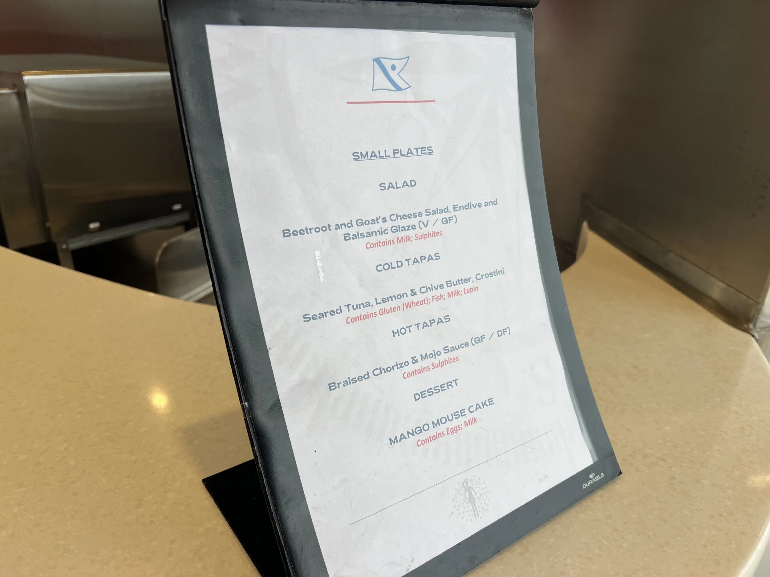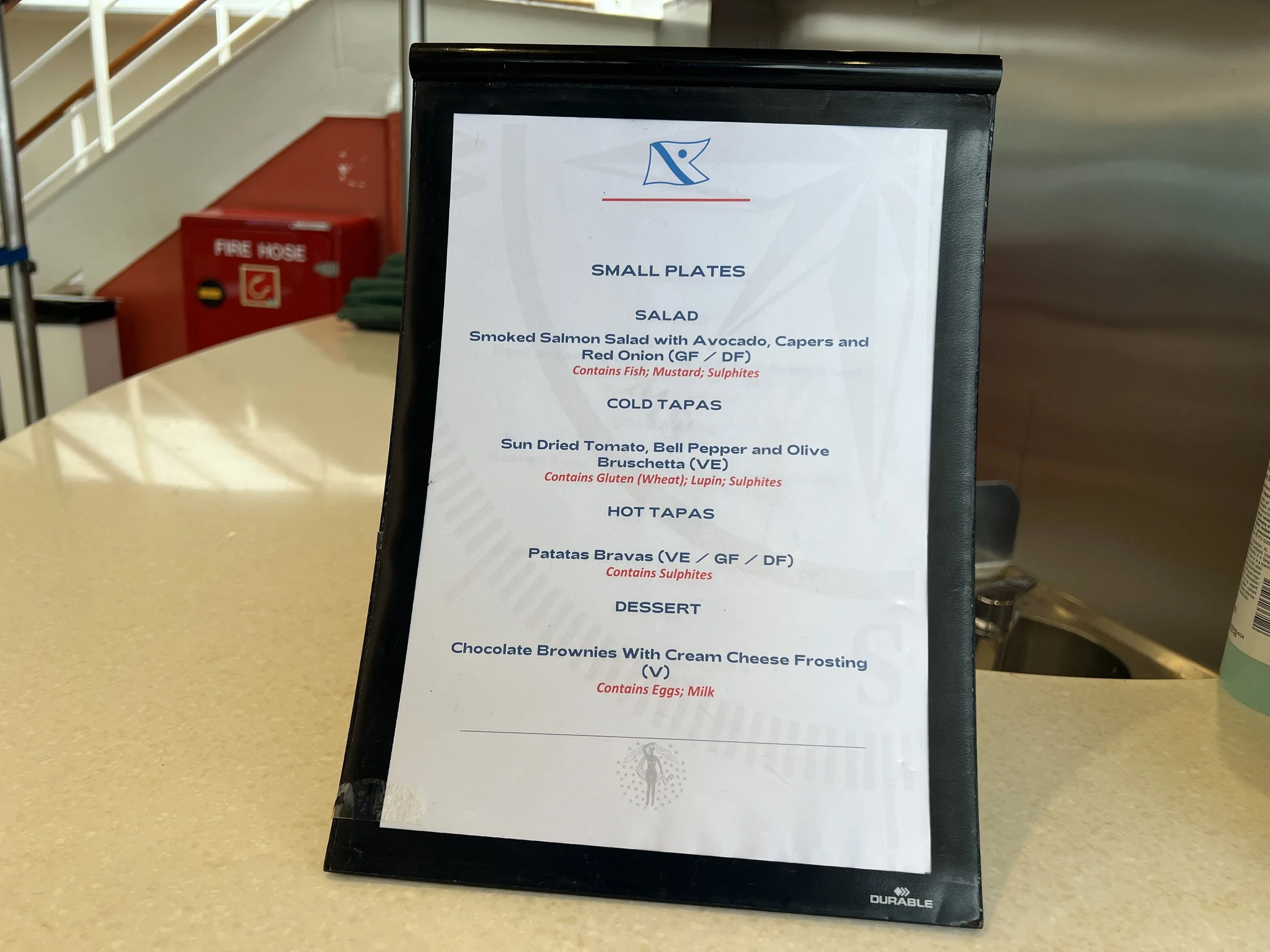So that’s pizza, but remember that there’s a tapas section, too! Fresco operates like a poolside eatery on most cruise ships - there’s a large display case featuring the menu items, but you can’t ‘grab and go’ due to the fact that they need to be heated or prepared fresh for you. Beside the display case, you’ll find the tapas, salad and dessert menu.