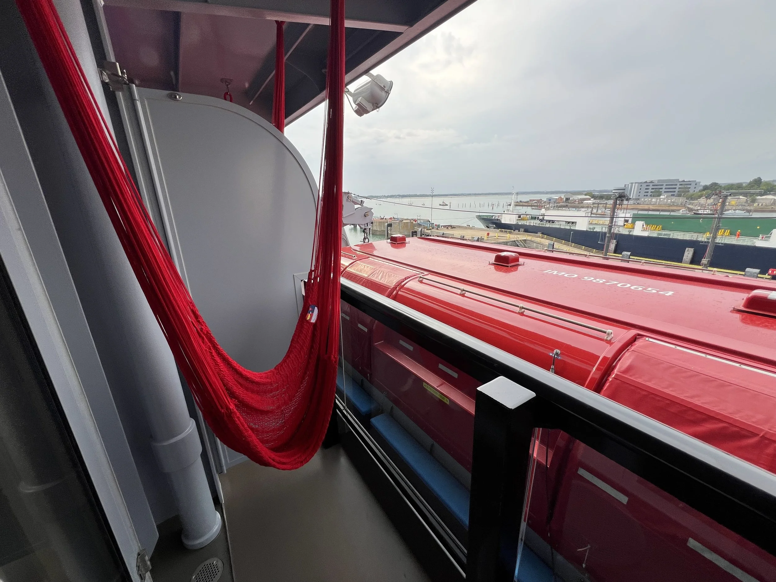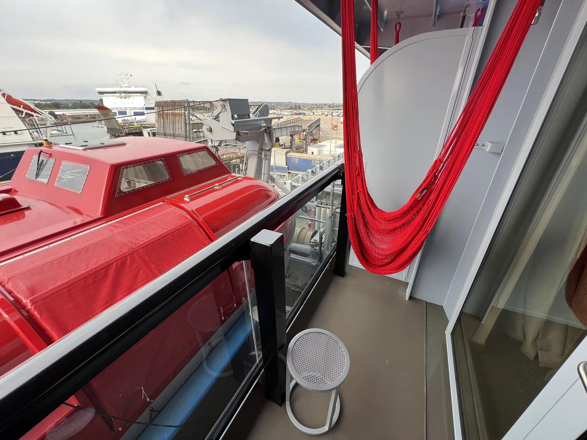 In all honesty, the balcony in these cabins is a lot smaller than the regular Sea Terraces. A typical Sea Terrace balcony is usually around 40 square feet, and this new variety comes in between 9 and 11 square feet. This means that there isn’t enough room for chairs out there, but Virgin Voyages have compensated by offering two hammocks instead - a fair offer, in my opinion. I guess these are offered instead as they don’t take up any space at all really - they’re just ropes, at the end of the day!