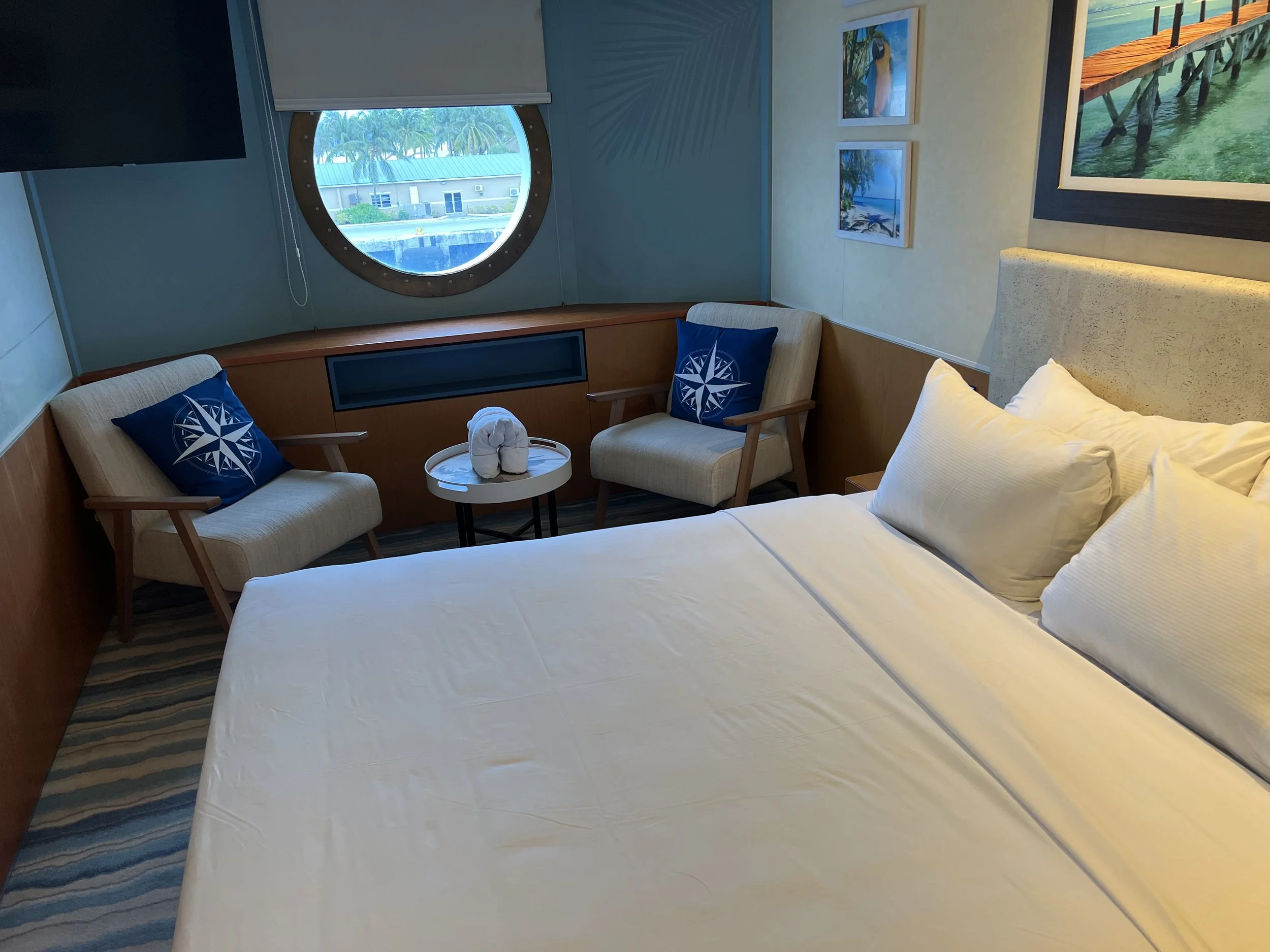Here’s an Ocean View cabin onboard Paradise, the first Margaritaville at Sea cruise ship. Can you imagine sharing this with your dog? You’d have a balcony too, of course!
